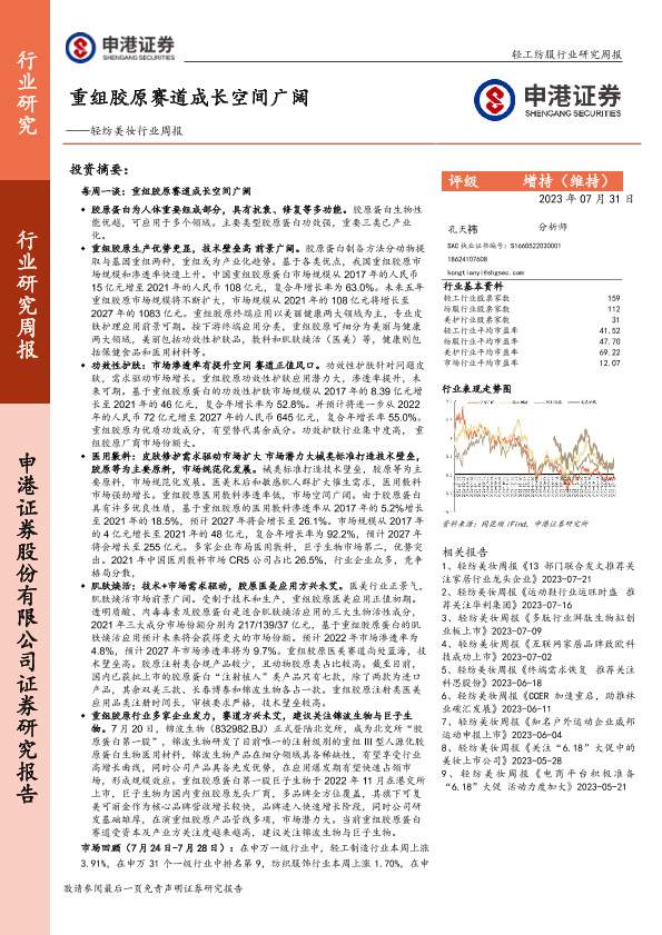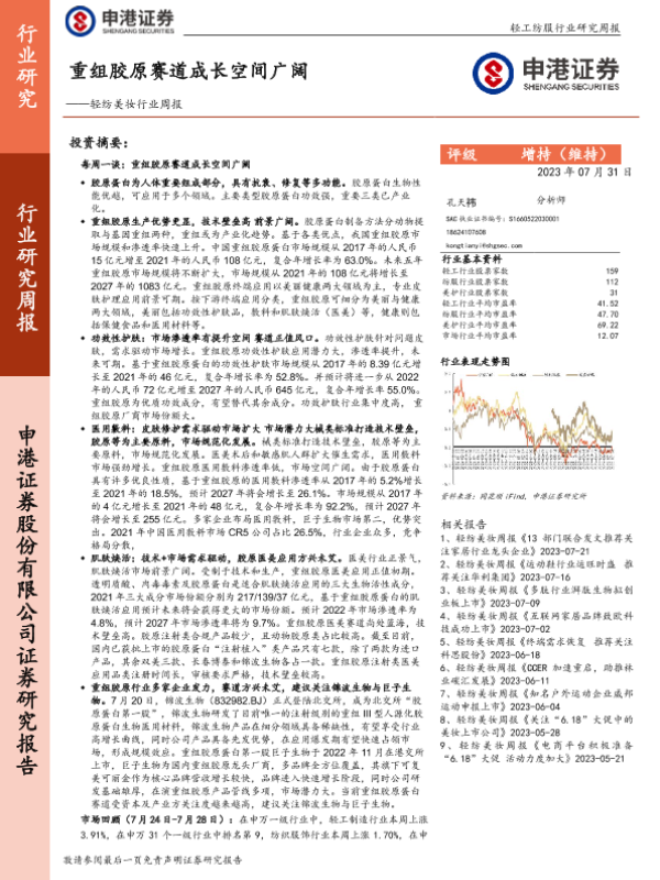 【申港证券】【20230731】轻纺美妆行业周报:重组胶原赛道成长空间广阔-21页