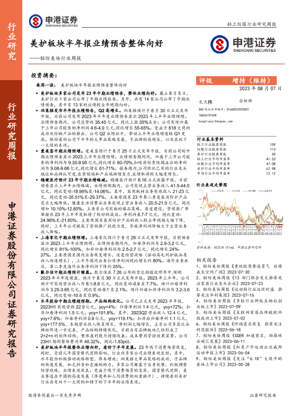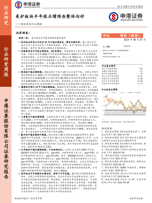 【申港证券】【20230807】轻纺美妆行业周报:美护板块半年报业绩预告整体向好-14页