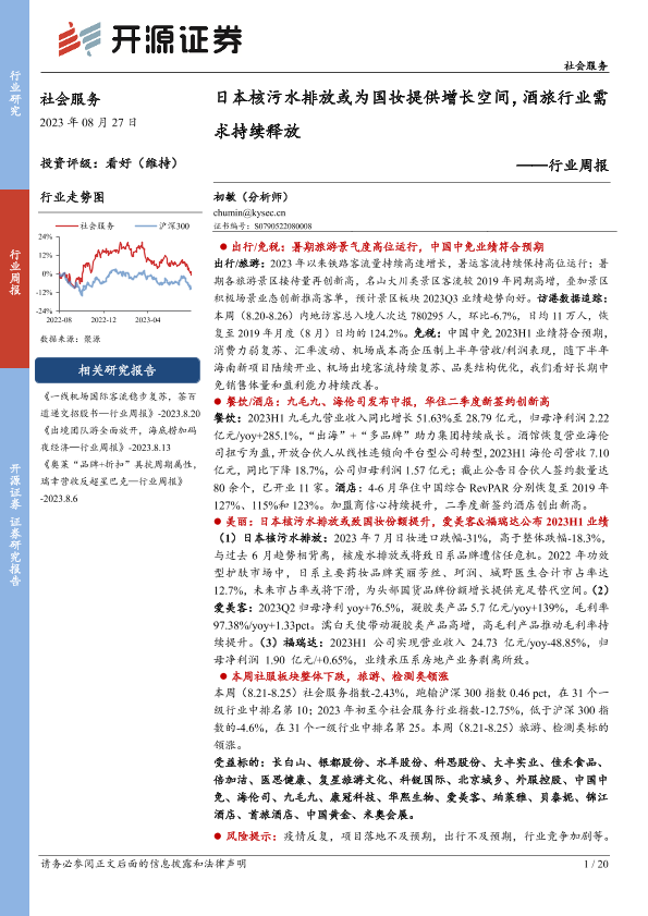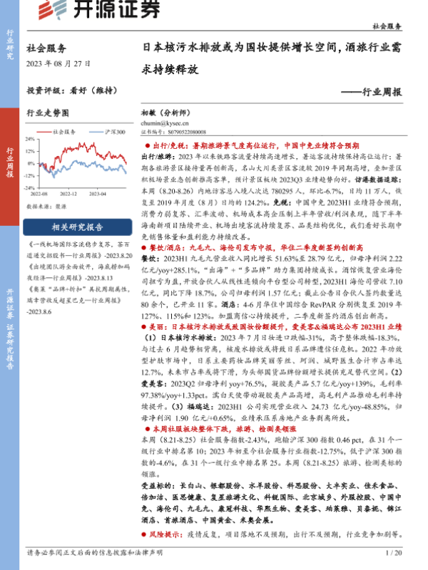 【开源证券】【20230827】社会服务行业周报:日本核污水排放或为国妆提供增长空间,酒旅行业需求持续释放-20页