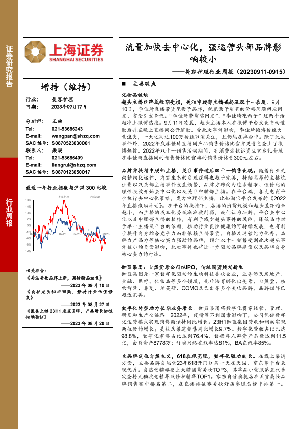 【上海证券】【20230917】美容护理行业周报:流量加快去中心化,强运营头部品牌影响较小-23页