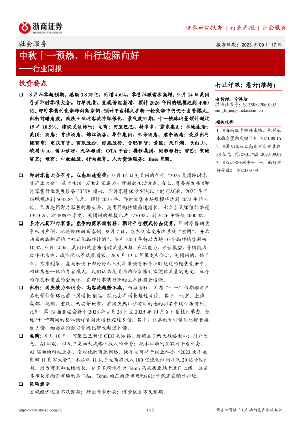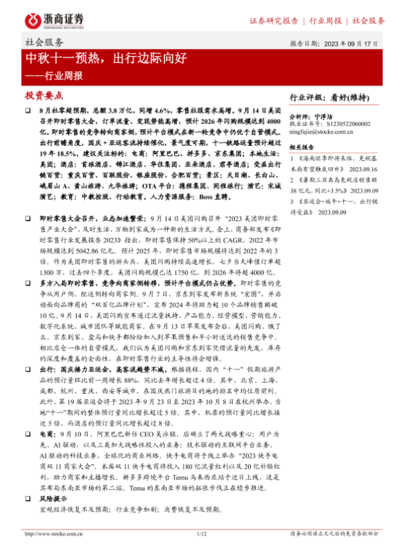 【浙商证券】【20230917】社会服务行业周报:中秋十一预热,出行边际向好-12页