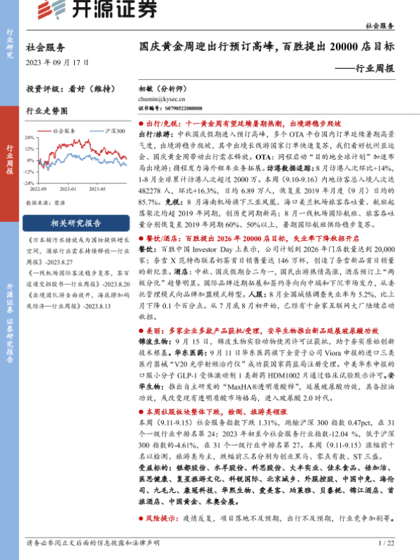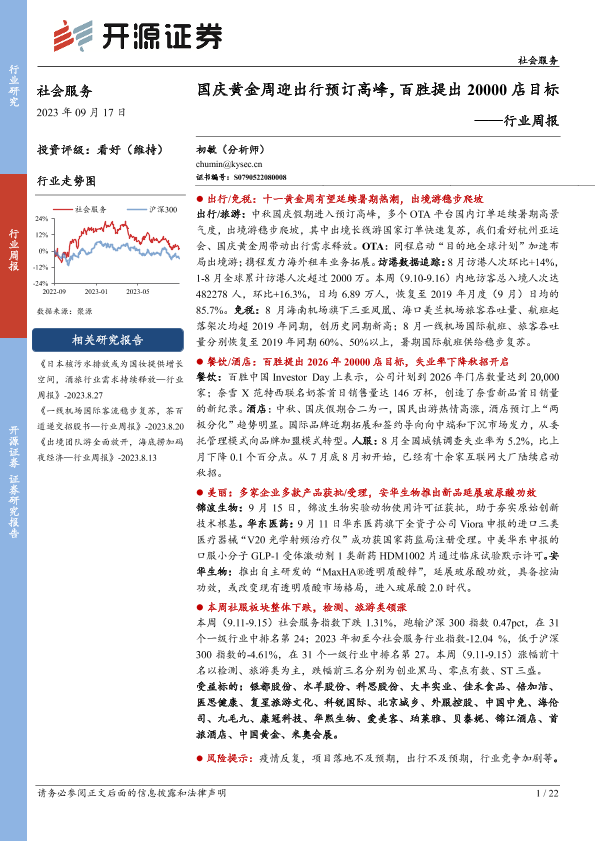 【开源证券】【20230917】社会服务行业周报:国庆黄金周迎出行预订高峰,百胜提出20000店目标-22页