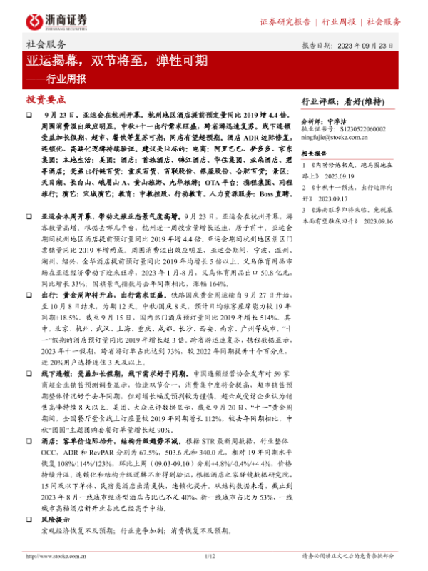【浙商证券】【20230923】社会服务行业周报:亚运揭幕,双节将至,弹性可期-12页