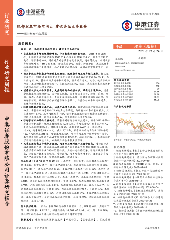 【申港证券】【20230924】轻纺美妆行业周报:眼部抗衰市场空间大 建议关注丸美股份-15页