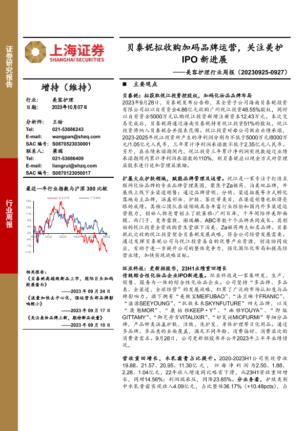 【上海证券】【20231007】美容护理行业周报:贝泰妮拟收购加码品牌运营,关注美护IPO新进展-20页