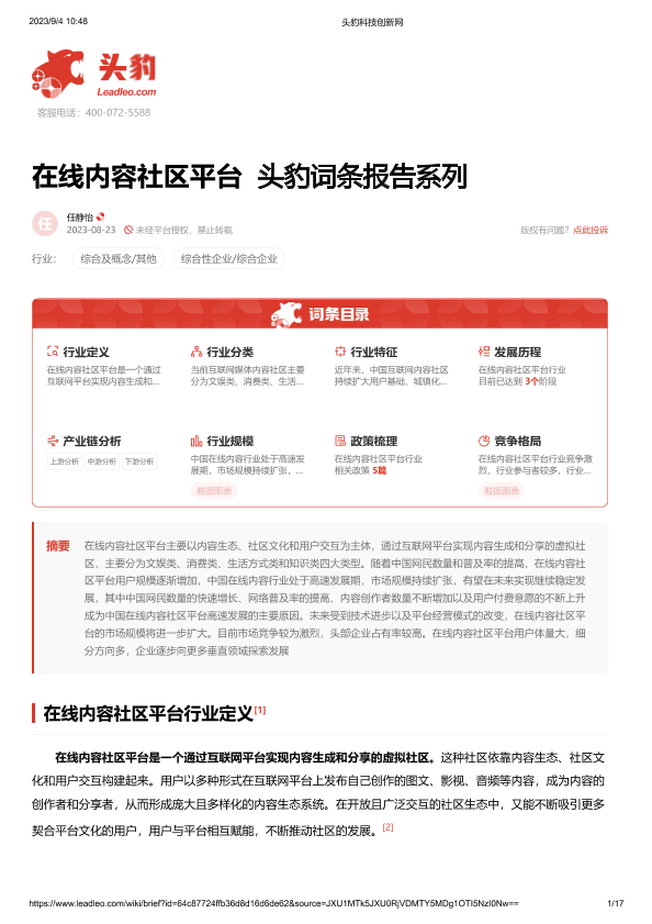 【头豹研究院】【20230823】在线内容社区平台 头豹词条报告系列-17页