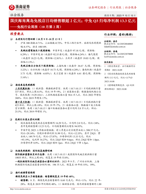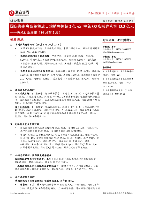 【浙商证券】【20231015】免税行业周报(10月第2周):国庆海南离岛免税店日均销售额超2亿元;中免Q3归母净利润13.3亿元-10页
