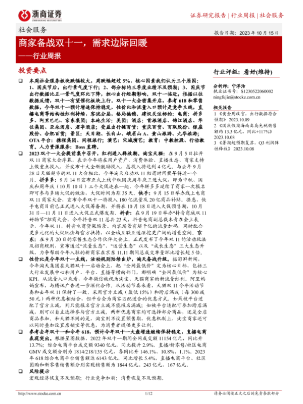 【浙商证券】【20231015】社会服务行业周报:商家备战双十一,需求边际回暖-12页