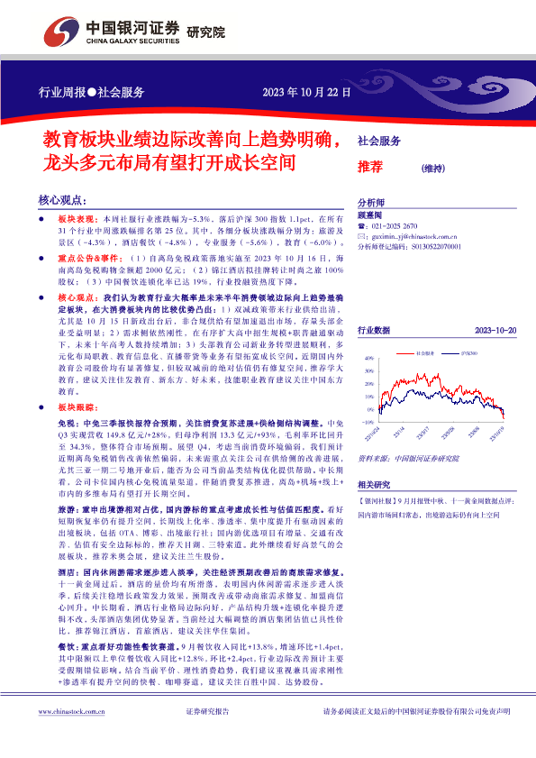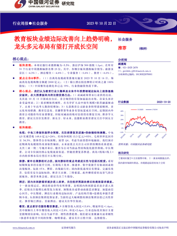 【银河证券】【20231022】社会服务行业周报:教育板块业绩边际改善向上趋势明确,龙头多元布局有望打开成长空间-14页
