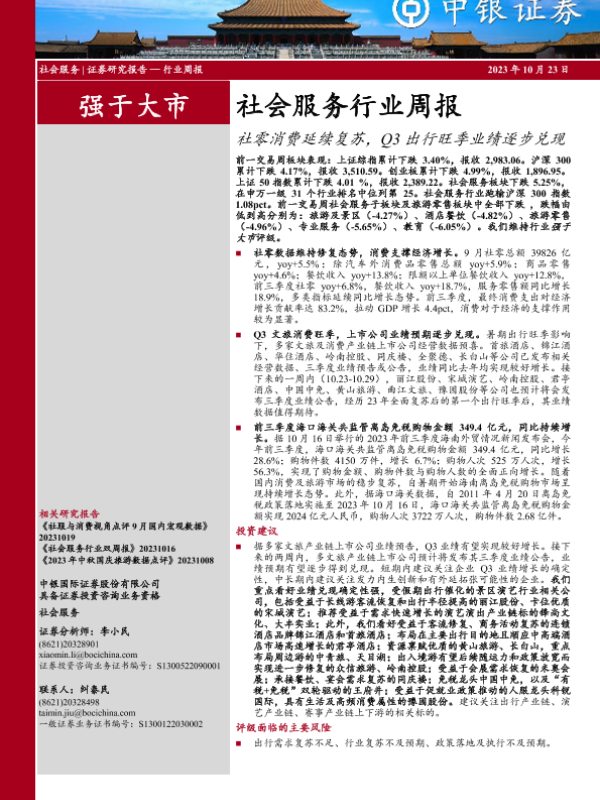 【中银证券】【20231023】社会服务行业周报:社零消费延续复苏,Q3出行旺季业绩逐步兑现-20页