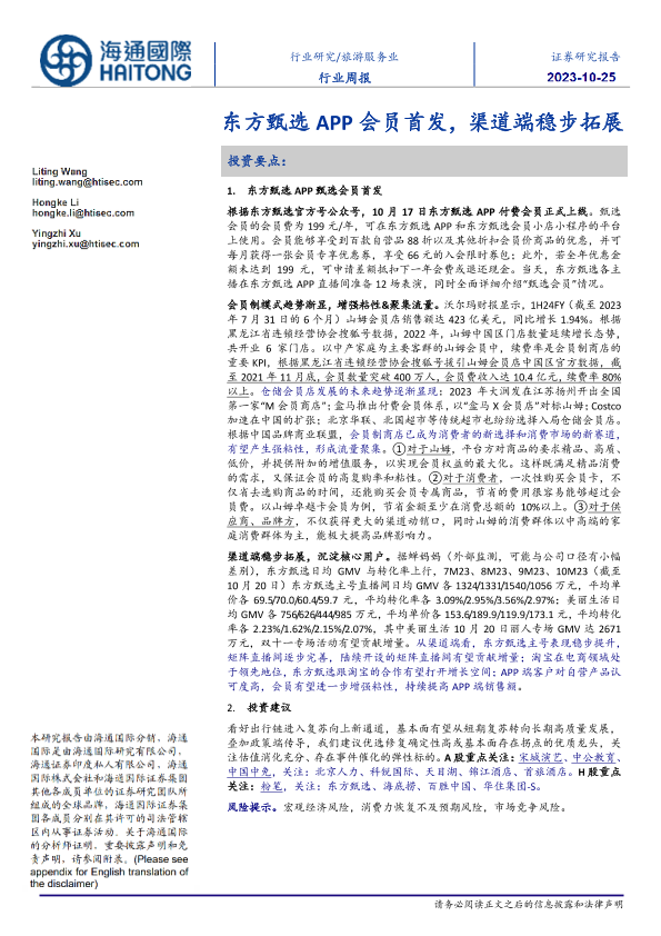 【海通国际】【20231025】旅游服务业行业周报:东方甄选APP会员首发,渠道端稳步拓展-13页