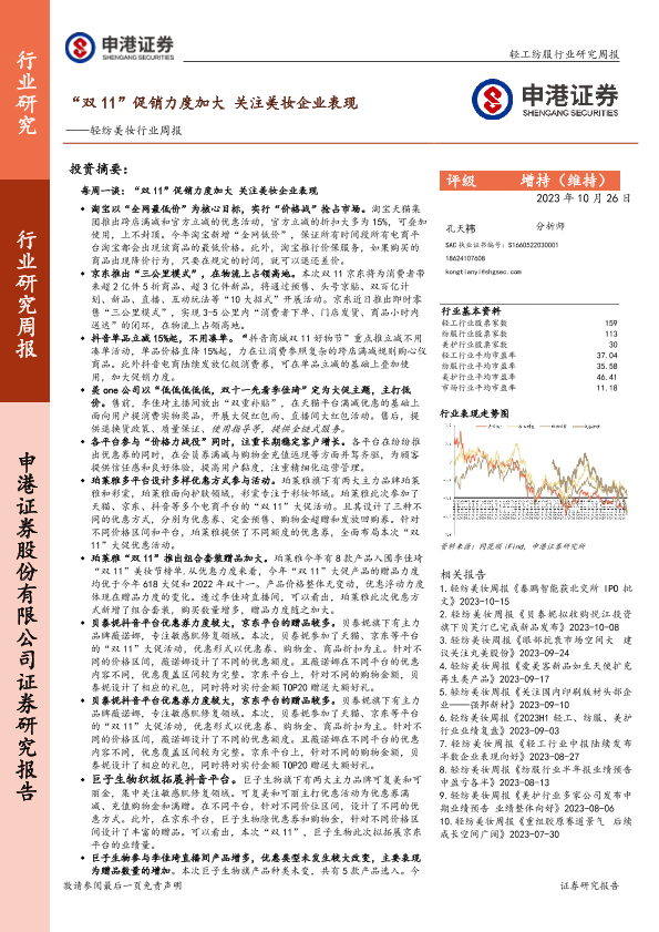 【申港证券】【20231026】轻纺美妆行业周报:“双11”促销力度加大 关注美妆企业表现-20页