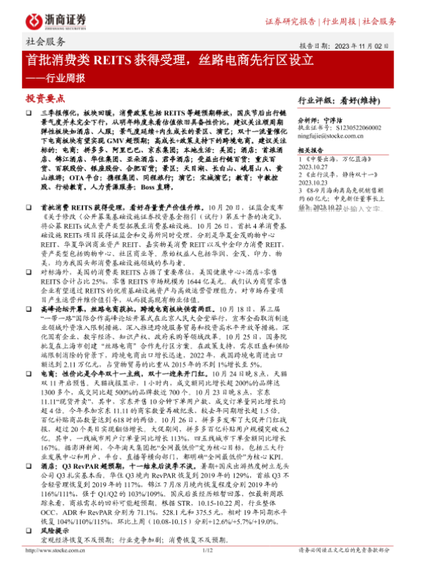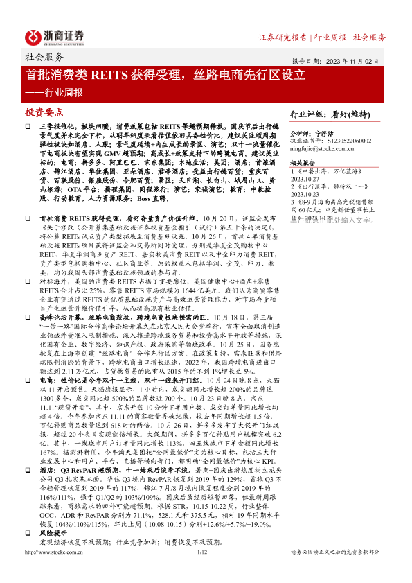 【浙商证券】【20231102】社会服务行业周报:首批消费类REITS获得受理,丝路电商先行区设立-12页