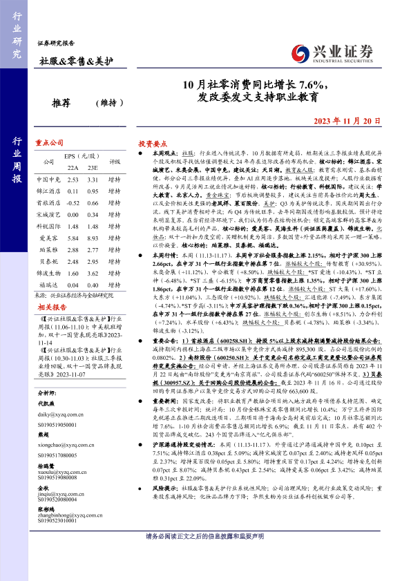【兴业证券】【20231120】10月社零消费同比增长7.6%,发改委发文支持职业教育-19页
