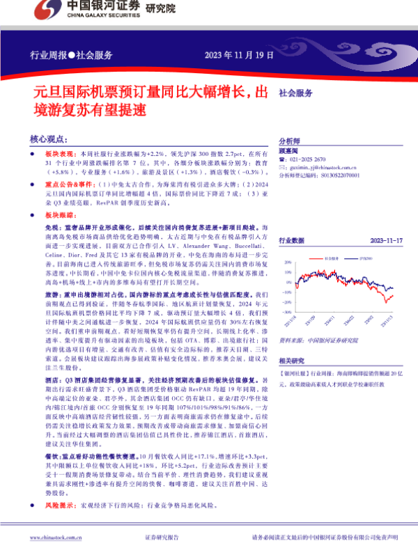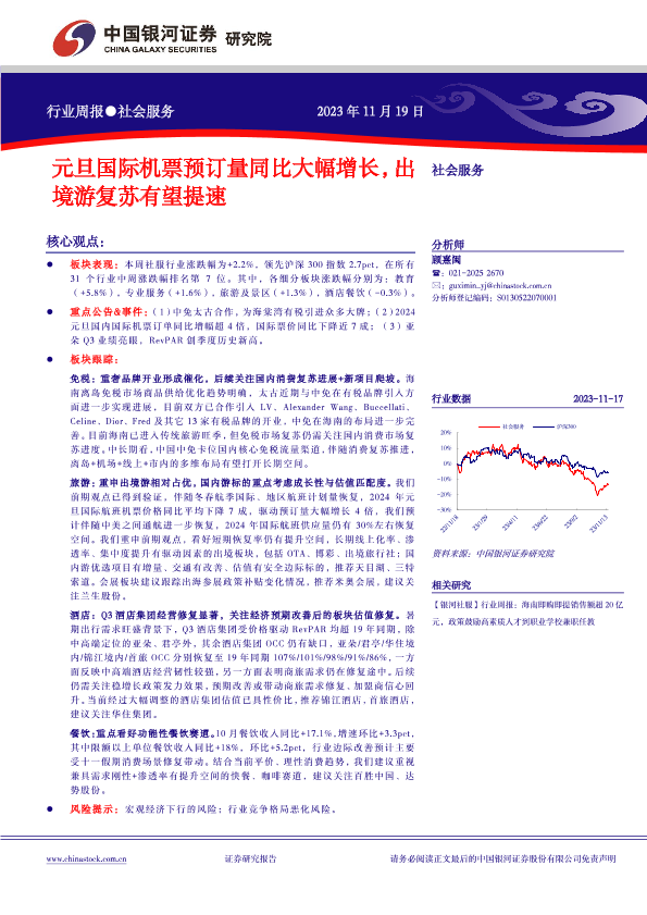【银河证券】【20231119】社会服务行业周报:元旦国际机票预订量同比大幅增长,出境游复苏有望提速-15页