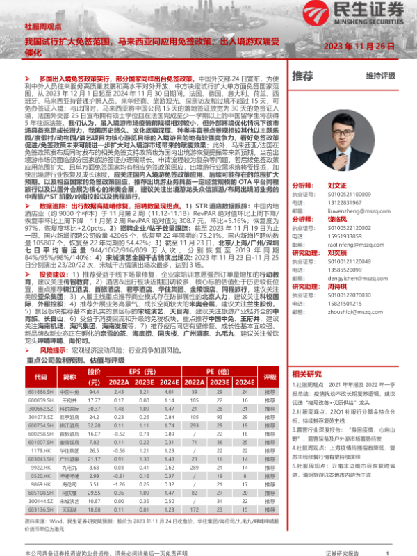 【民生证券】【20231126】社服周观点:我国试行扩大免签范围,马来西亚同应用免签政策,出入境游双端受催化-21页