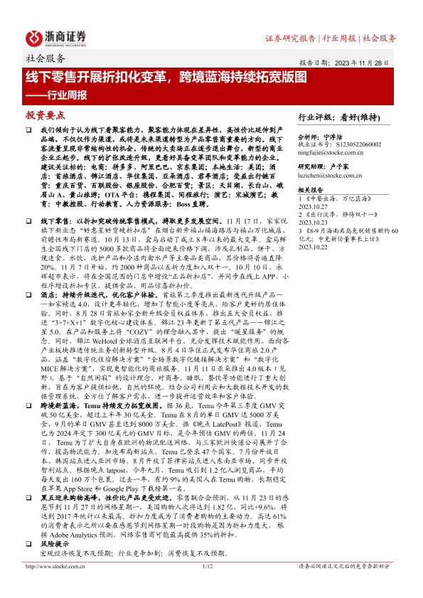 【浙商证券】【20231128】社会服务行业周报:线下零售开展折扣化变革,跨境蓝海持续拓宽版图-12页
