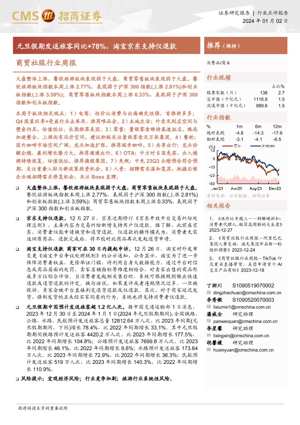 【海通证券】【20240102】商贸社服行业周报:元旦假期发送旅客同比+78%,淘宝京东支持仅退款-11页