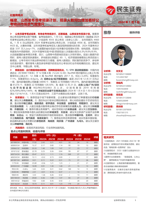 【民生证券】【20240107】社服周观点:福建、山西发布省考招录计划,招录人数同比增加看好公考培训市场景气度提升-21页