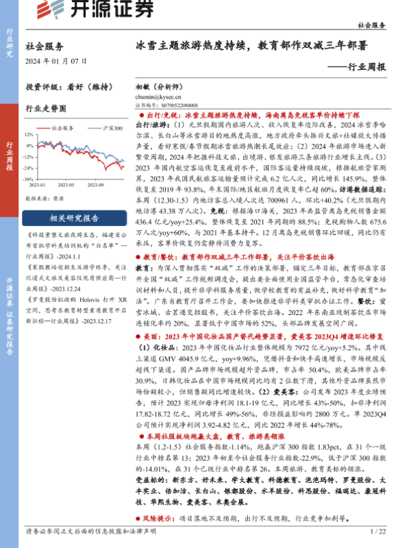 【开源证券】【20240107】社会服务行业周报:冰雪主题旅游热度持续,教育部作双减三年部署-22页