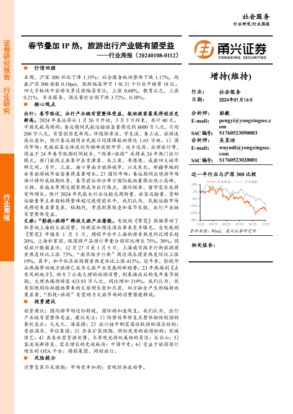 【甬兴证券】【20240116】社会服务行业周报:春节叠加IP热,旅游出行产业链有望受益-12页