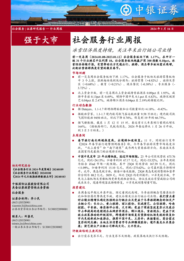 【中银证券】【20240116】社会服务行业周报:冰雪经济热度持续,关注年末出行链公司业绩-16页