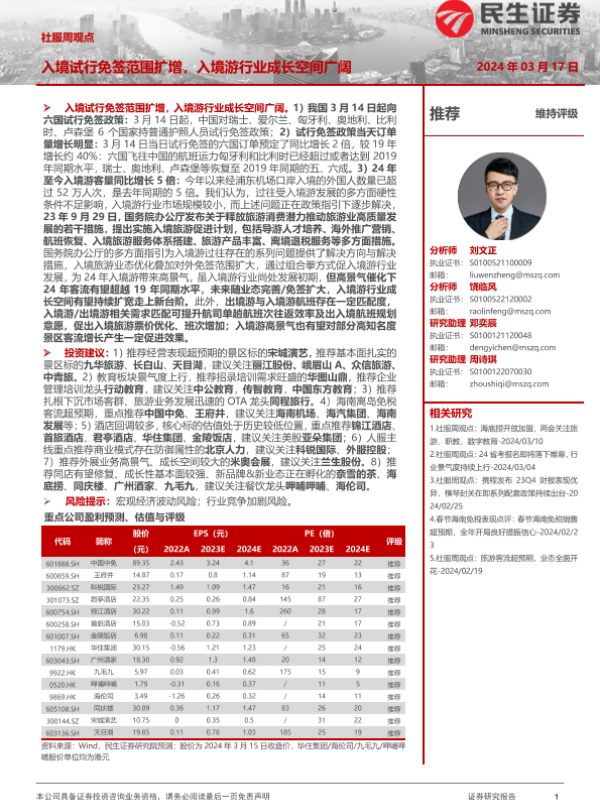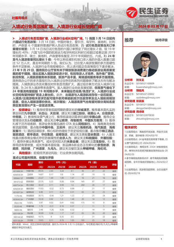 【民生证券】【20240317】社服周观点:入境试行免签范围扩增,入境游行业成长空间广阔-20页
