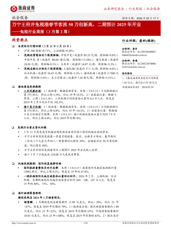 【浙商证券】【20240317】万宁王府井免税港春节客流50万创新高,二期预计2025年开业-10页