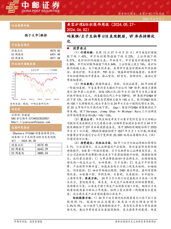 【中邮证券】【20240602】美容护理&纺织服饰周报:珀莱雅 巨子生物等618表现靓丽,VF库存持续优化-12页