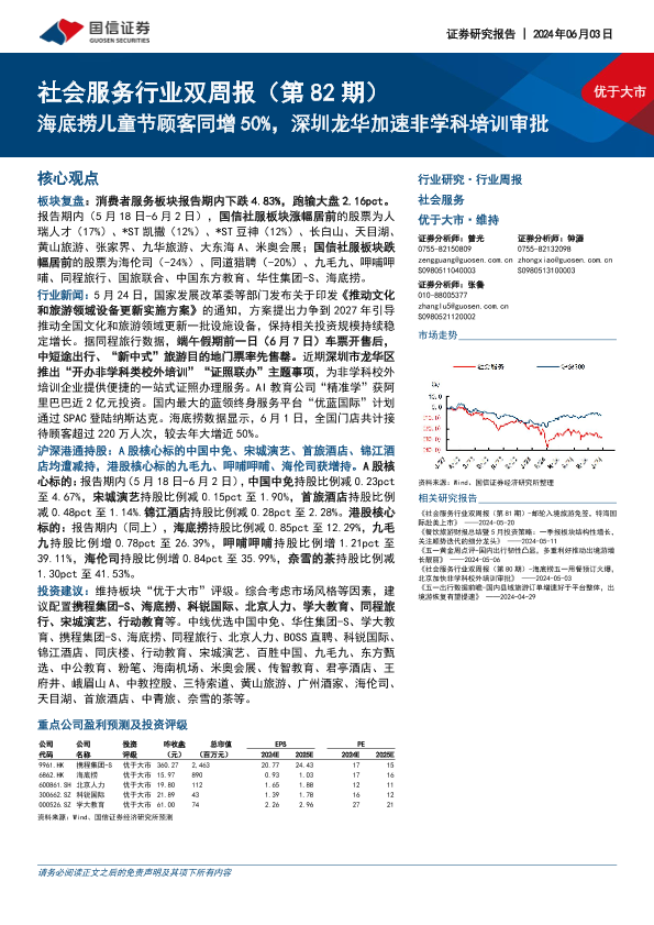 【国信证券】【20240603】社会服务行业双周报(第82期):海底捞儿童节顾客同增50%,深圳龙华加速非学科培训审批-12页