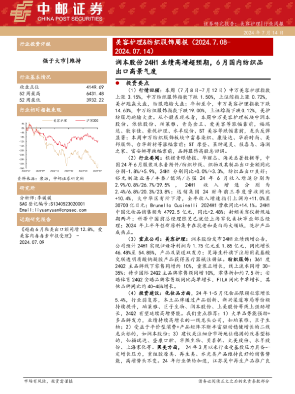 【中邮证券】【20240714】美容护理&纺织服饰周报:润本股份24H1业绩高增超预期,6月国内纺织品出口高景气度-13页