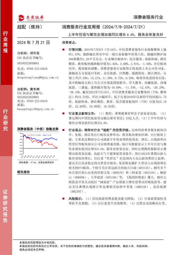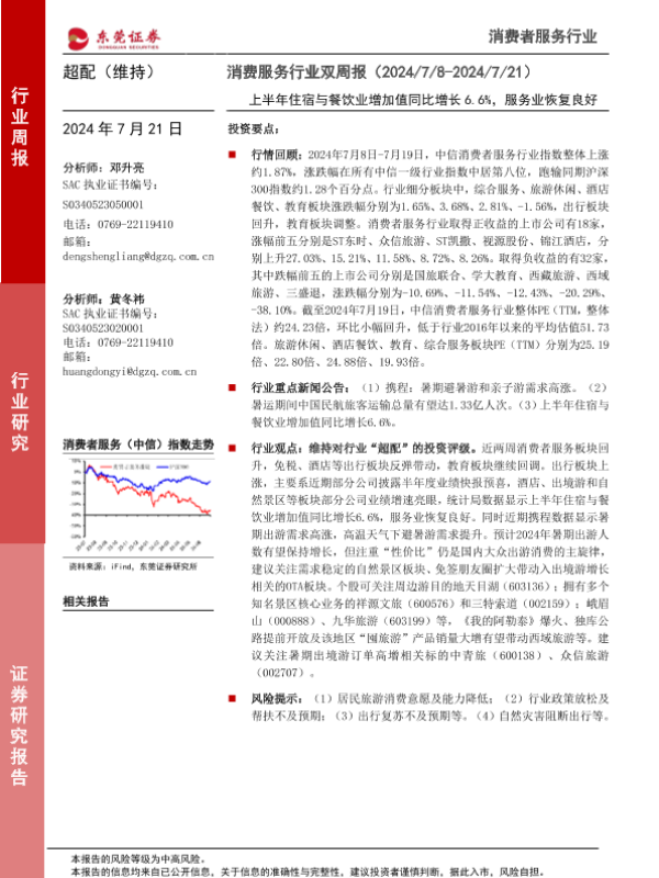 【东莞证券】【20240721】消费者服务行业双周报:上半年住宿与餐饮业增加值同比增长6.6%,服务业恢复良好-10页