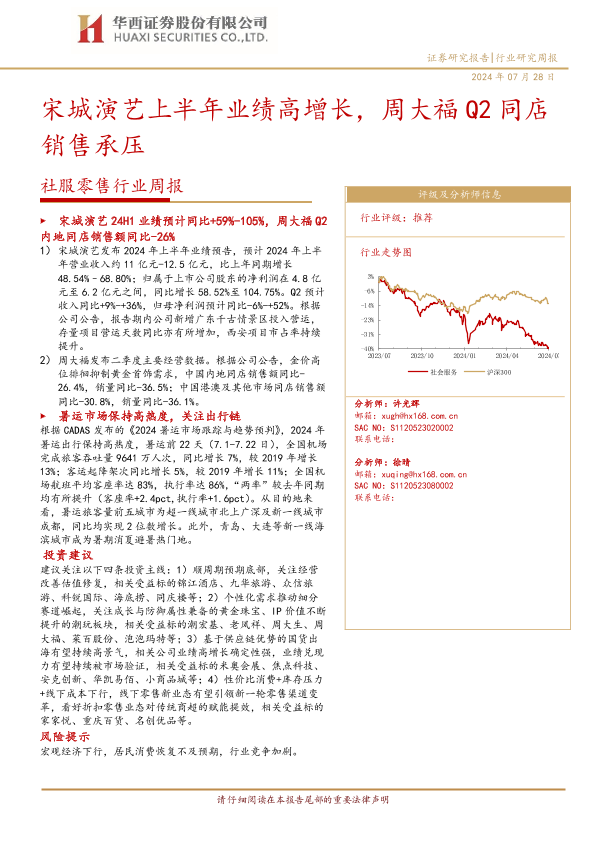 【华西证券】【20240728】社服零售行业周报:宋城演艺上半年业绩高增长,周大福Q2同店销售承压-11页