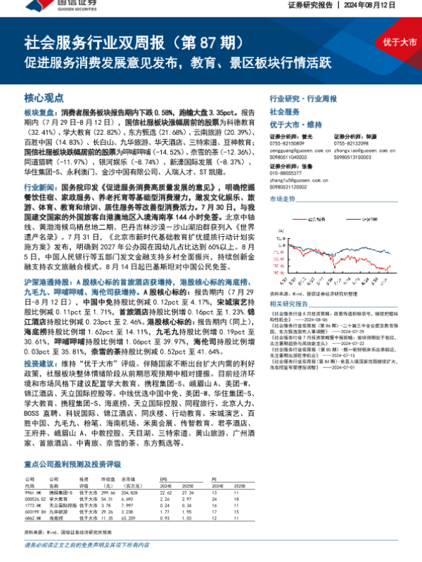 【国信证券】【20240812】社会服务行业双周报:促进服务消费发展意见发布,教育、景区板块行情活跃-10页