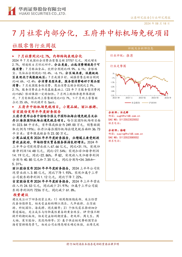 【华西证券】【20240818】社服零售行业周报:7月社零内部分化,王府井中标机场免税项目-14页