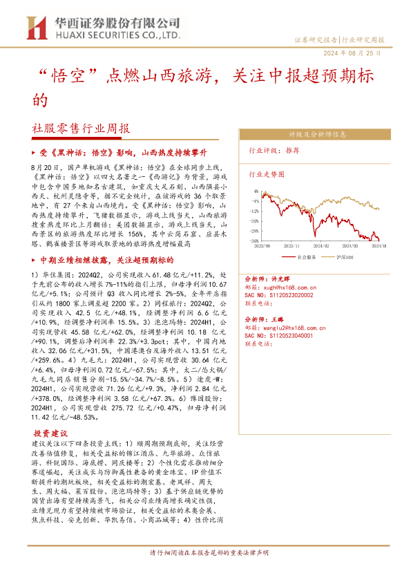 中期业绩 投资建议 社服零售 黑神话悟空 山西旅游