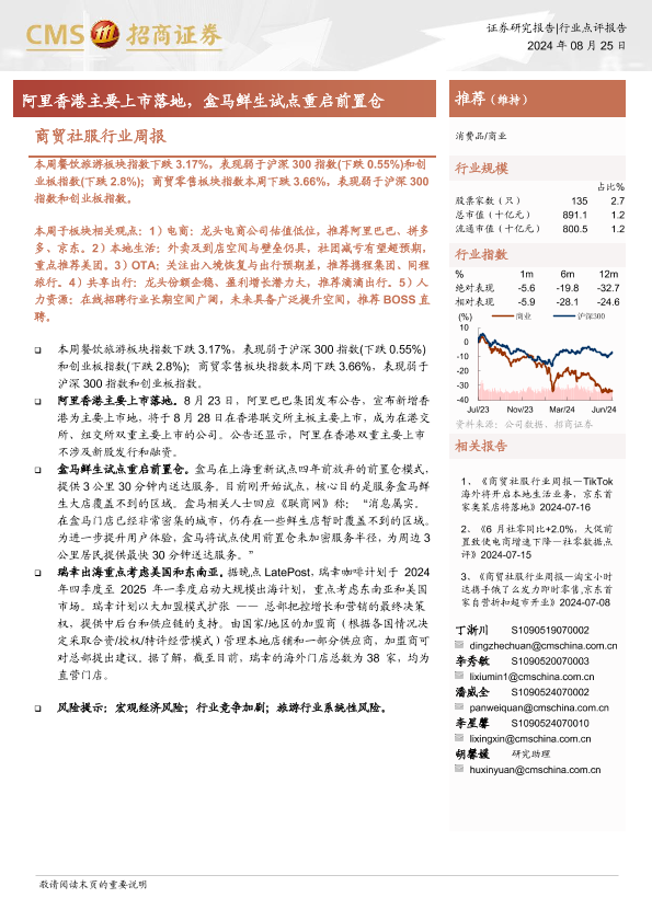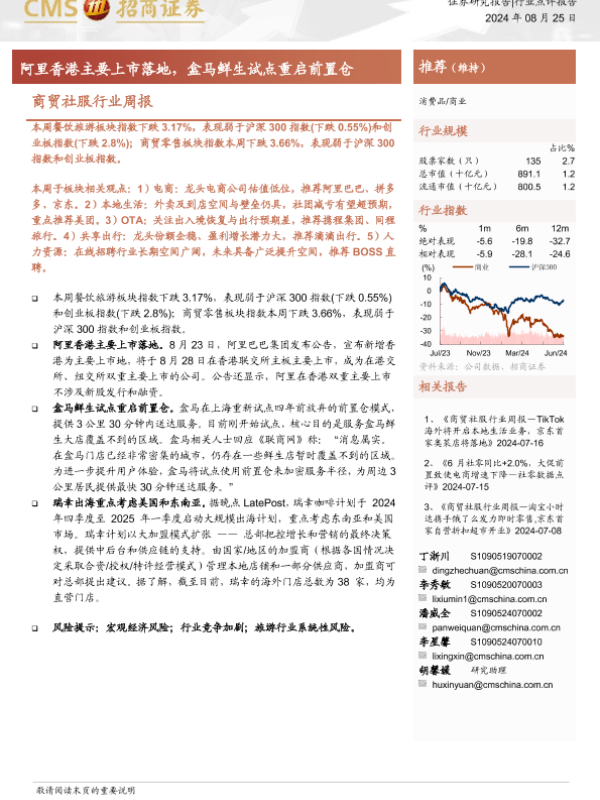 【海通证券】【20240825】商贸社服行业周报:阿里香港主要上市落地,盒马鲜生试点重启前置仓-10页