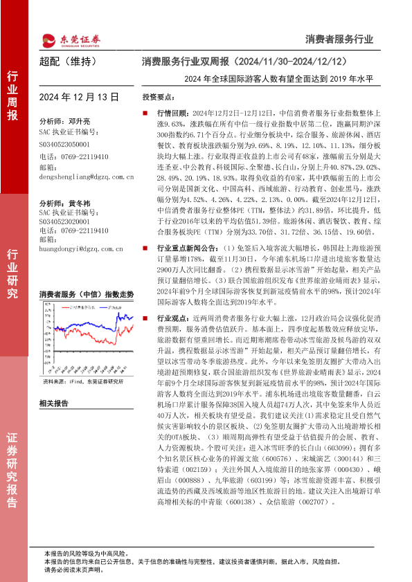 【东莞证券】【20241213】消费服务行业双周报:2024年全球国际游客人数有望全面达到2019年水平-11页