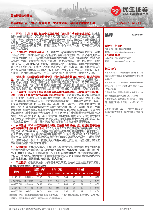 【民生证券】【20241221】美妆行业动态报告:微信小店开启“送礼”灰度测试,关注社交裂变浪潮带来的投资机会-12页