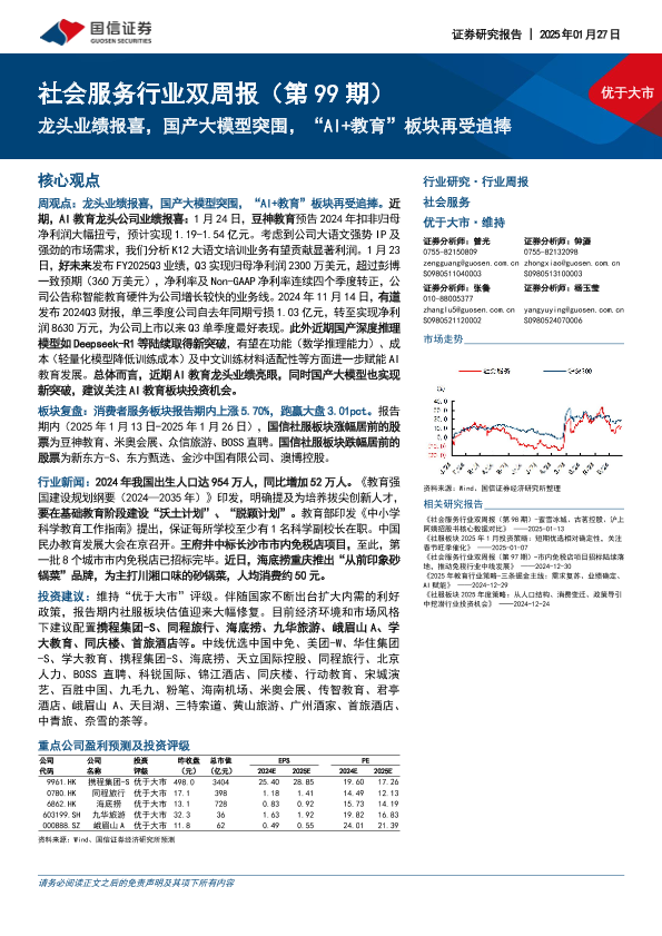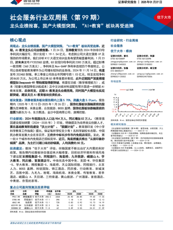【国信证券】【20250127】社会服务行业双周报(第99期):龙头业绩报喜,国产大模型突围,“AI+教育”板块再受追捧-11页