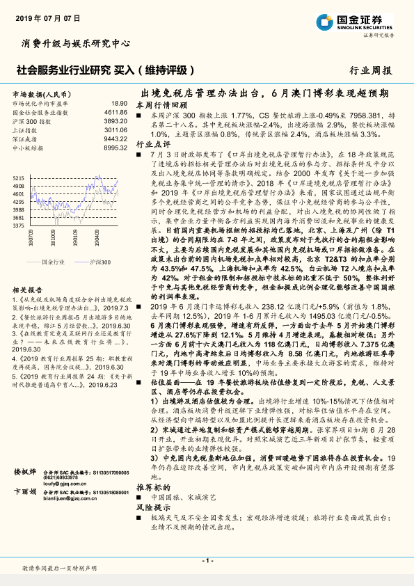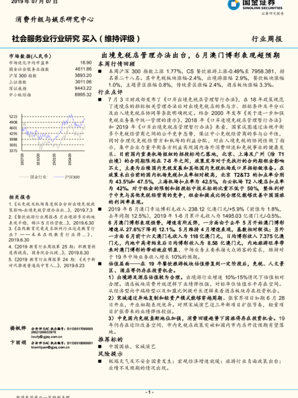 【国金证券】【20190707】社会服务业行业研究周报:出境免税店管理办法出台,6月澳门博彩表现超预期-11页