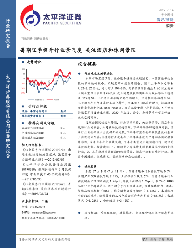 【太平洋证券】【20190714】消费行业周报:暑期旺季提升行业景气度 关注酒店和休闲景区-14页
