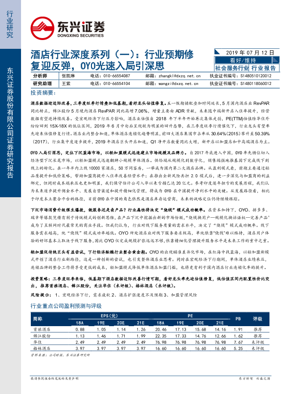 【东兴证券】【20190712】酒店行业深度系列(一):行业预期修复迎反弹,OYO光速入局引深思-32页