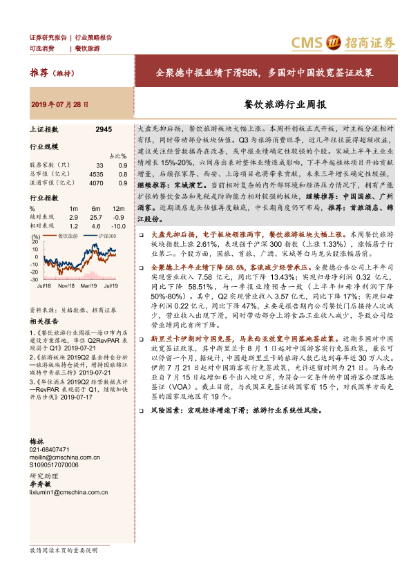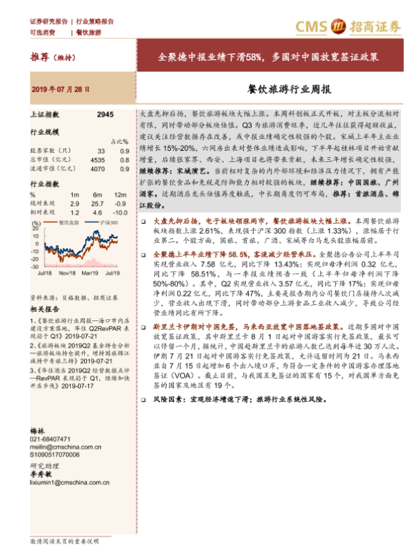 【海通证券】【20190728】餐饮旅游行业周报:全聚德中报业绩下滑58%,多国对中国放宽签证政策-7页