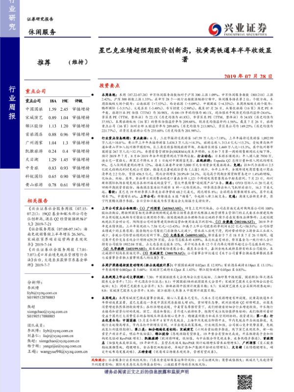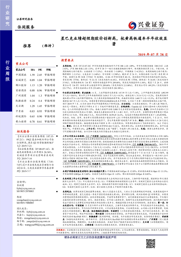 【兴业证券】【20190728】星巴克业绩超预期股价创新高,杭黄高铁通车半年收效显著-15页