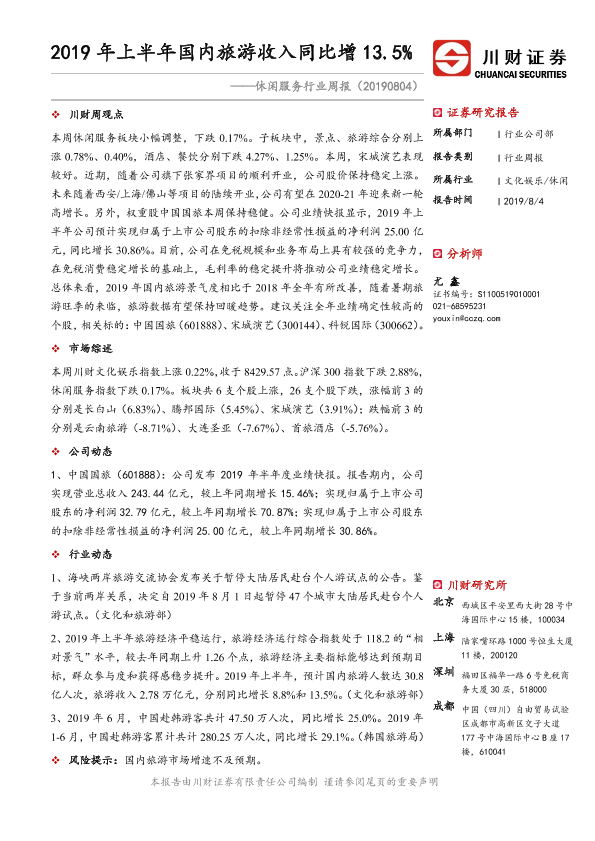 【川财证券】【20190804】2019年上半年国内旅游收入同比增13.5%-9页
