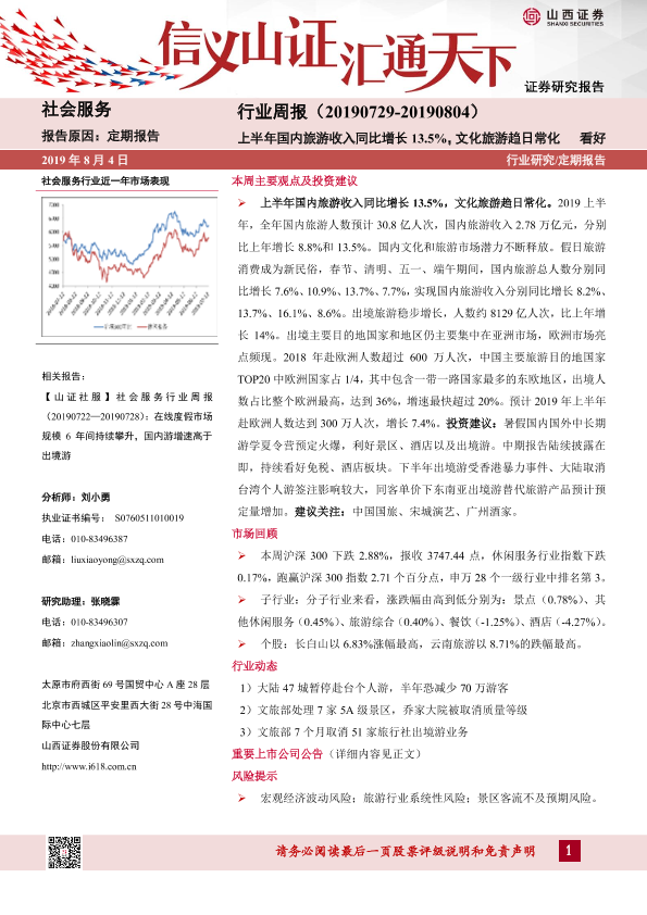 【山西证券】【20190804】行业周报:上半年国内旅游收入同比增长13.5%,文化旅游趋日常化-9页