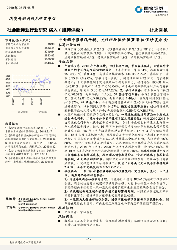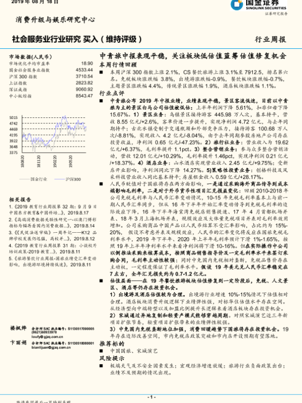 【国金证券】【20190818】社会服务业行业周报:中青旅中报表现平稳,关注板块低估值蓝筹估值修复机会-11页