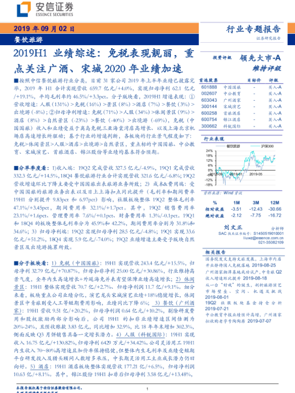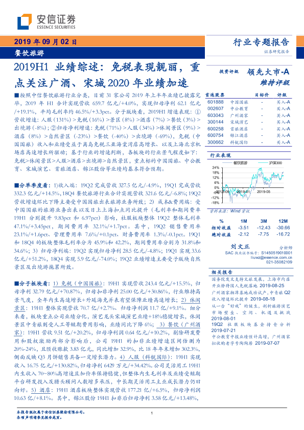 【安信证券】【20190902】餐饮旅游行业2019H1业绩综述:免税表现靓丽,重点关注广酒、宋城2020年业绩加速-24页