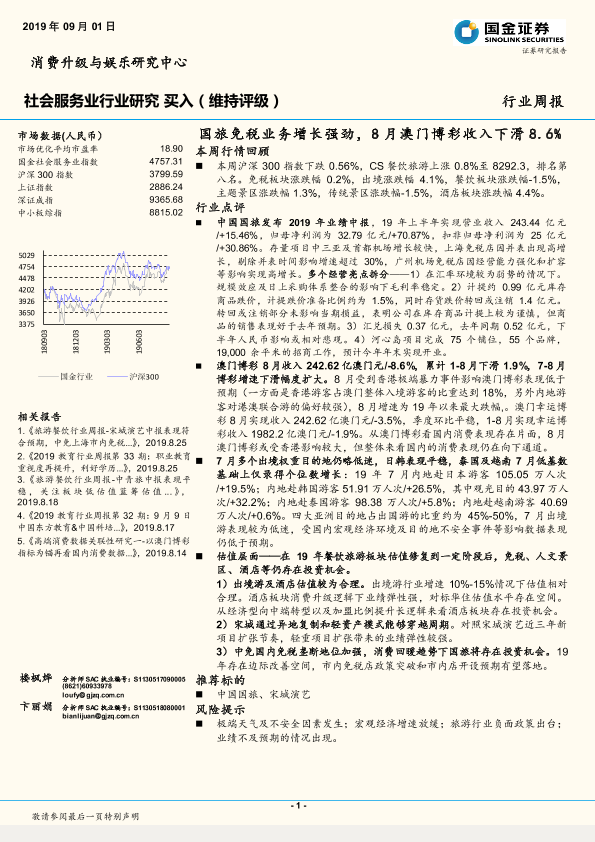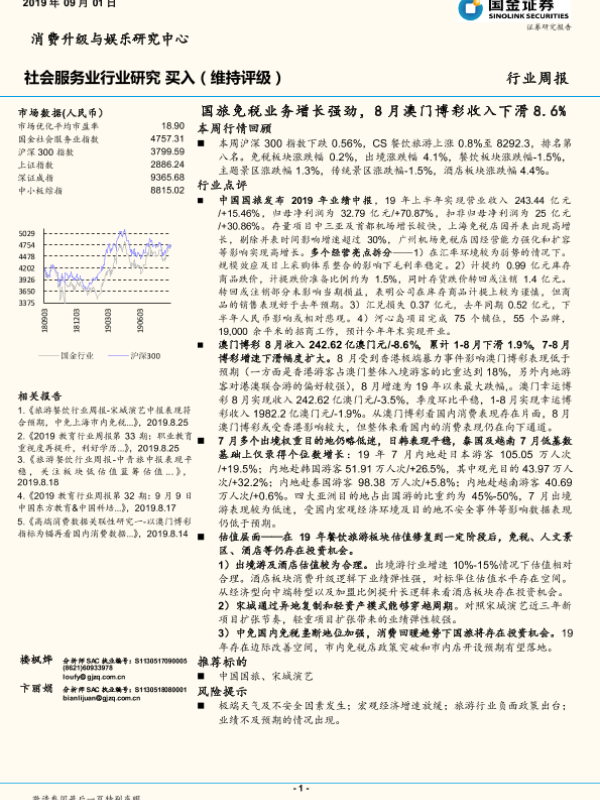 【国金证券】【20190901】国旅免税业务增长强劲,8月澳门博彩收入下滑8.6%-13页